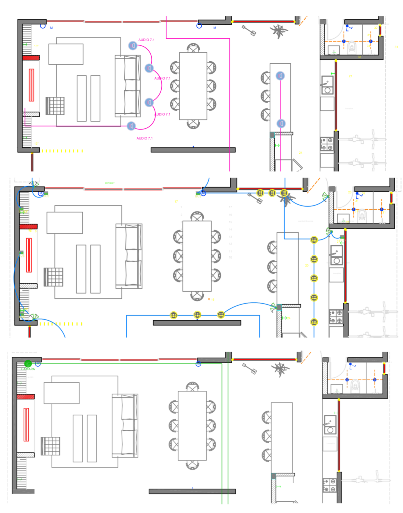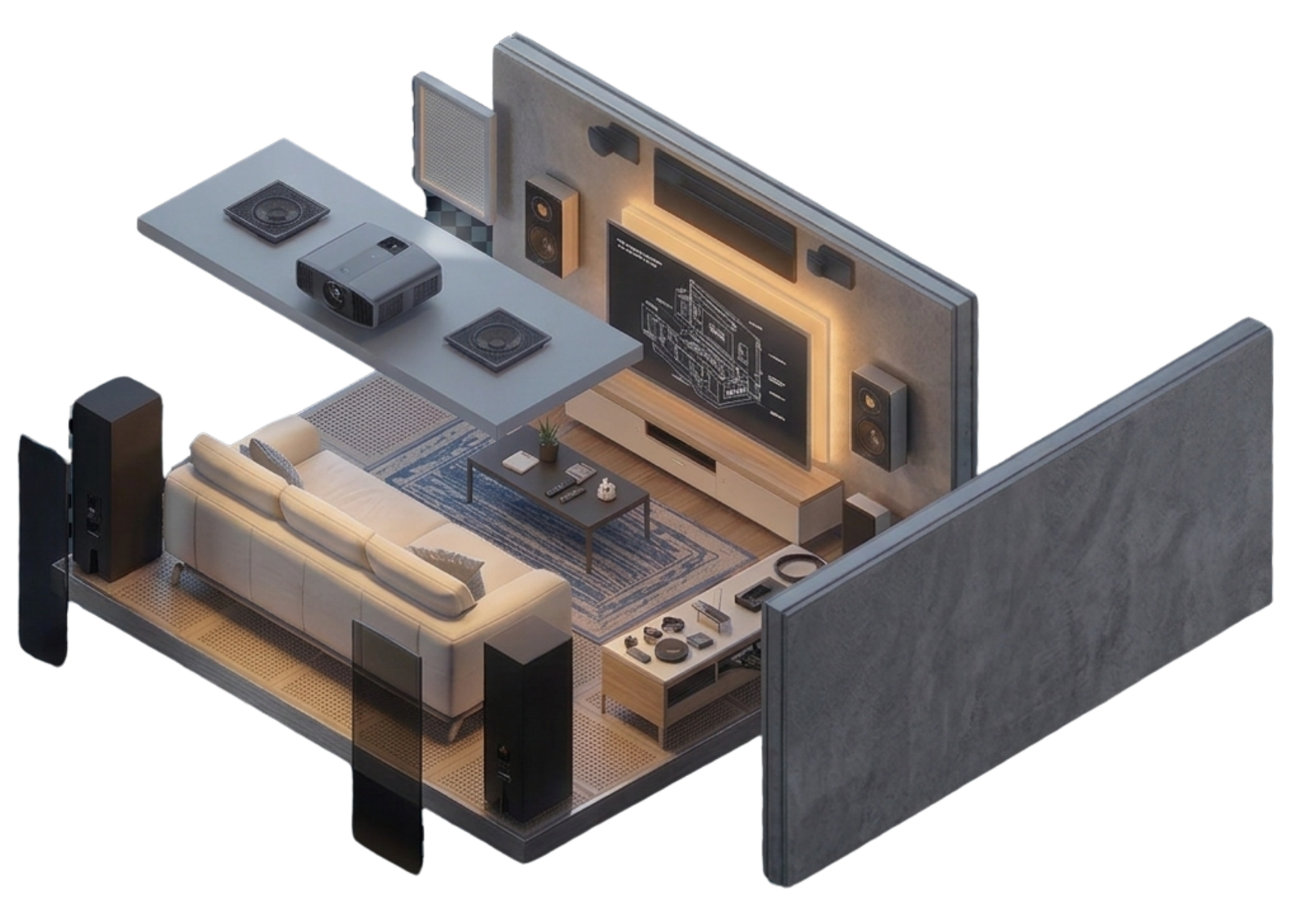 Ingeniería y Diseño de Salas Privadas Realizamos el proyecto técnico integral de tu cine: planos de conectividad, cálculo de audio 7.1 o Atmos, ubicación acústica de parlantes y asesoramiento experto en tecnología de visualización (4K/8K y Proyección).